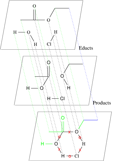 In the second option for this assignment, your task is to find possible chemical reactions between sets of molecules. You are given a set of educts and a set of products in SMILES notation and your task is to infer all possible graph grammar rules. 90% of all chemical reactions have a so-called mono-cyclic transition state. In the following Figure the reaction for the equilibrium system {ethyl acetate, water} {ethanol-acetic, acid}, with hydrogen chloride as a catalyst is illustrated.