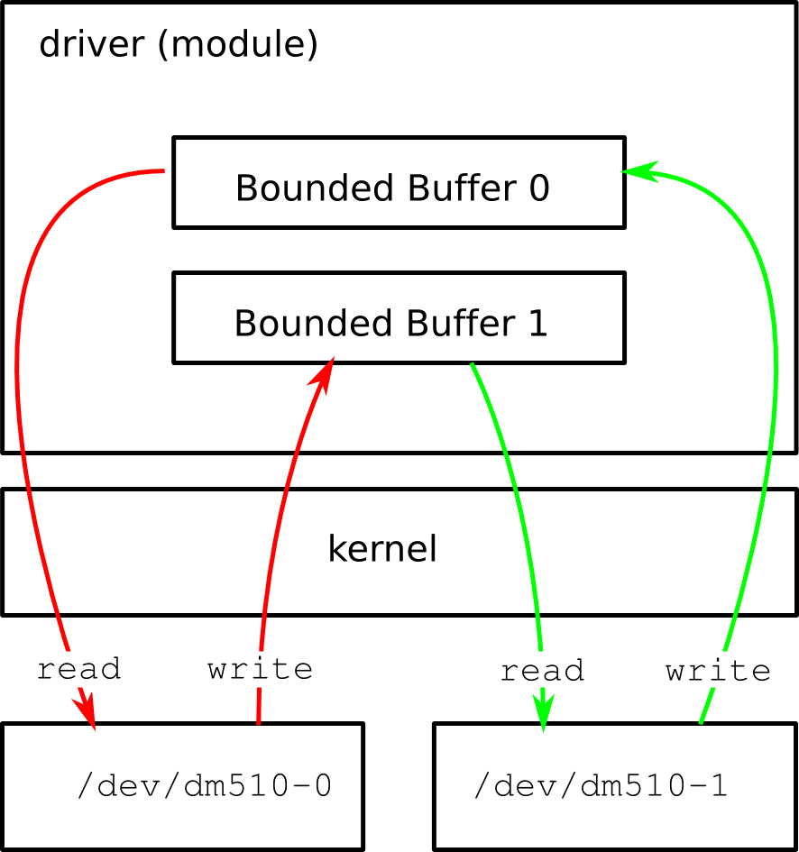 The figure to the left illustrates how the driver should work. Basically it solves the producer-consumer problem. Here the two processes can be both producers and consumers. This resembles the functionality of a real hardware device driver, where both the hardware and the kernel can produce and consume data.